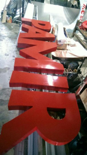huruf timbul galvanis bisa dikombinasikan dengan acrylik dan nyala lampu berpendar kebelakang. untuk finishing bahan ini menggunakan cat duco pilihan.